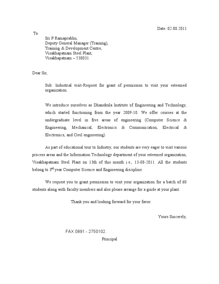Approval Letter For Industrial Visit Letter